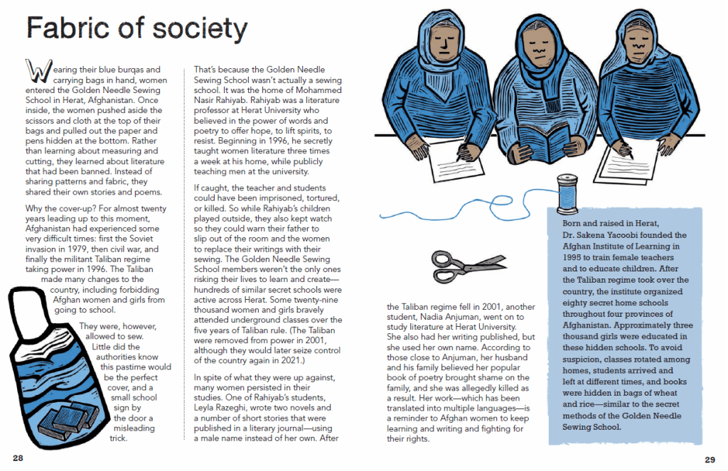 Vivid linocut illustrations and interesting facts enhance the book’s 15 true stories of resilience and courage in the pursuit of education. Accompanying profiles for each story introduce readers to an important person who played a significant role in each secret school. Concluding with a look at inventive approaches to education in today’s world, this deep dive into clandestine learning will invite readers to think deeply about the meaning of education and the barriers many face in accessing it.